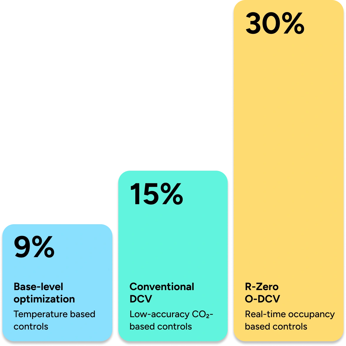 R-Zero’s occupancy-driven ventilation adjusts airflow dynamically based on where people actually are, not a fixed schedule or out of date proxy like CO2. Achieve up to 30% HVAC energy savings—while ensuring tenant comfort every step of the way.